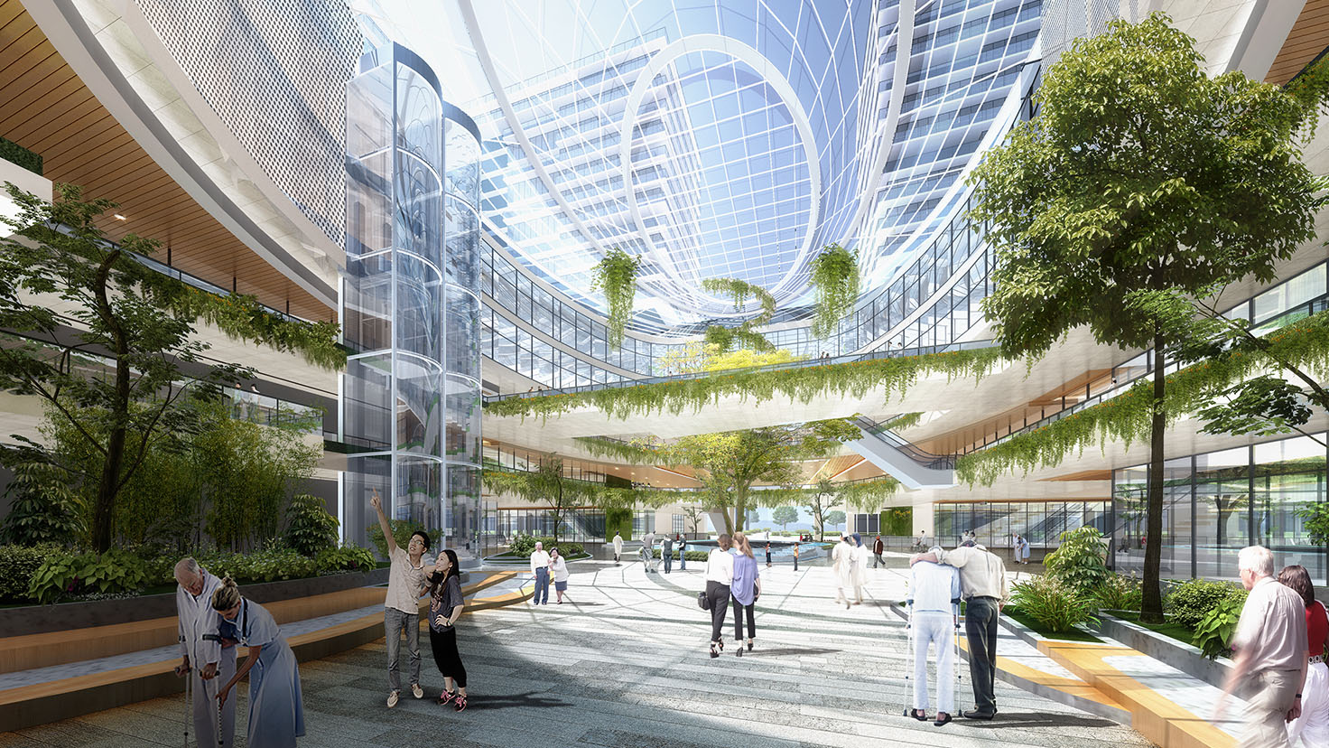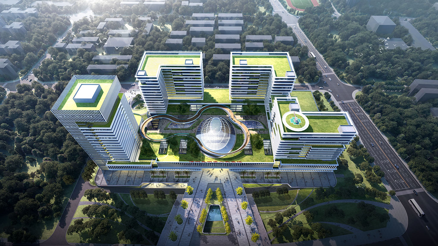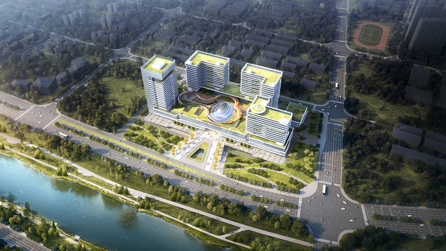 設(shè)計(jì)背景:以十字型街為骨架、跳動(dòng)的綠心為主題,在高度集約化的建筑布局下利用富有節(jié)奏感的線條及體塊的變化,創(chuàng)造呼吸感,通過屋頂康復(fù)花園、空中花園的設(shè)計(jì)緩解用地緊張帶來(lái)的綠地缺失。