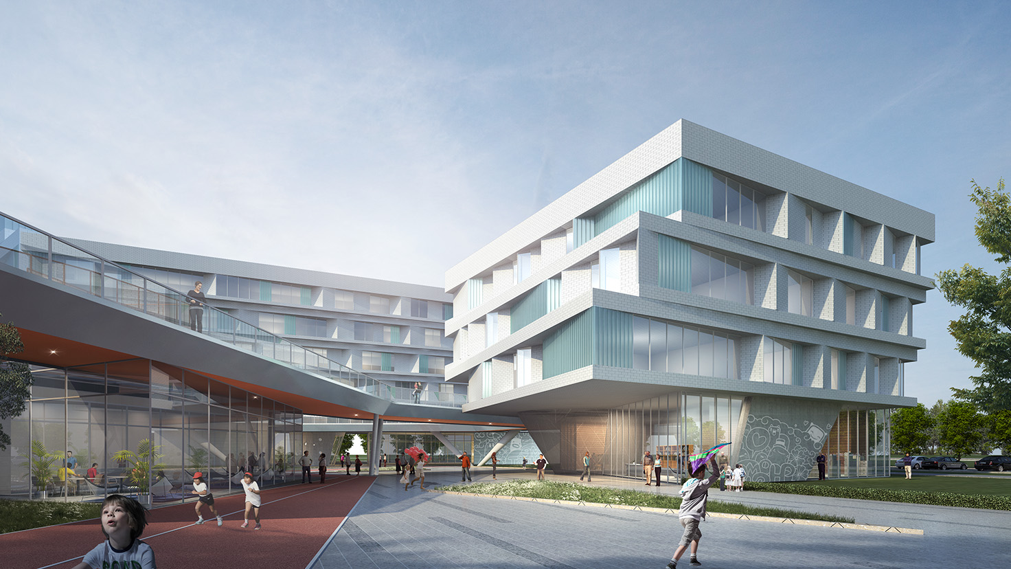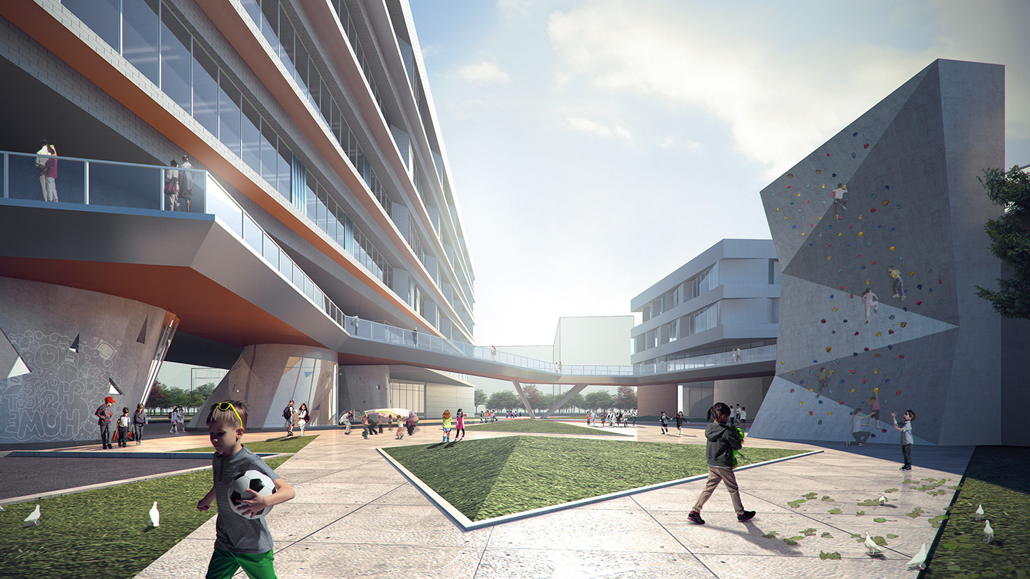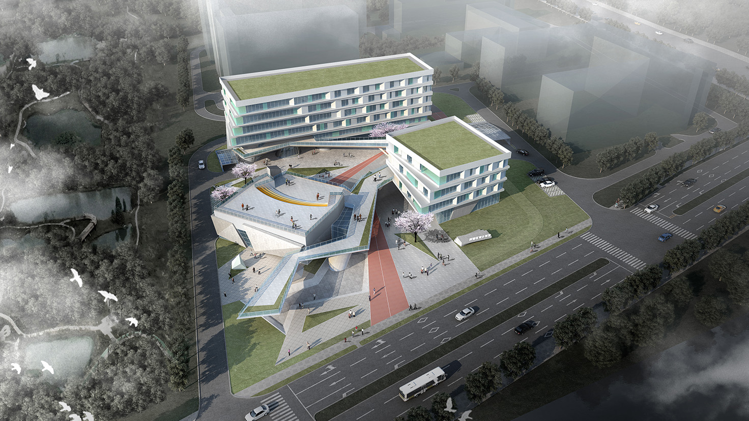 采用分散式布局,利用多層次的室外平臺將各個功能分區(qū)聯(lián)系起來,營造立體公園式的公共交流空間;橢圓形的運動場館臨濱河路布置,具有較好的標志性和引導性;入口前廣場與旁邊福利中心的廣場結合,促進更豐富的城市文化活動的展開。