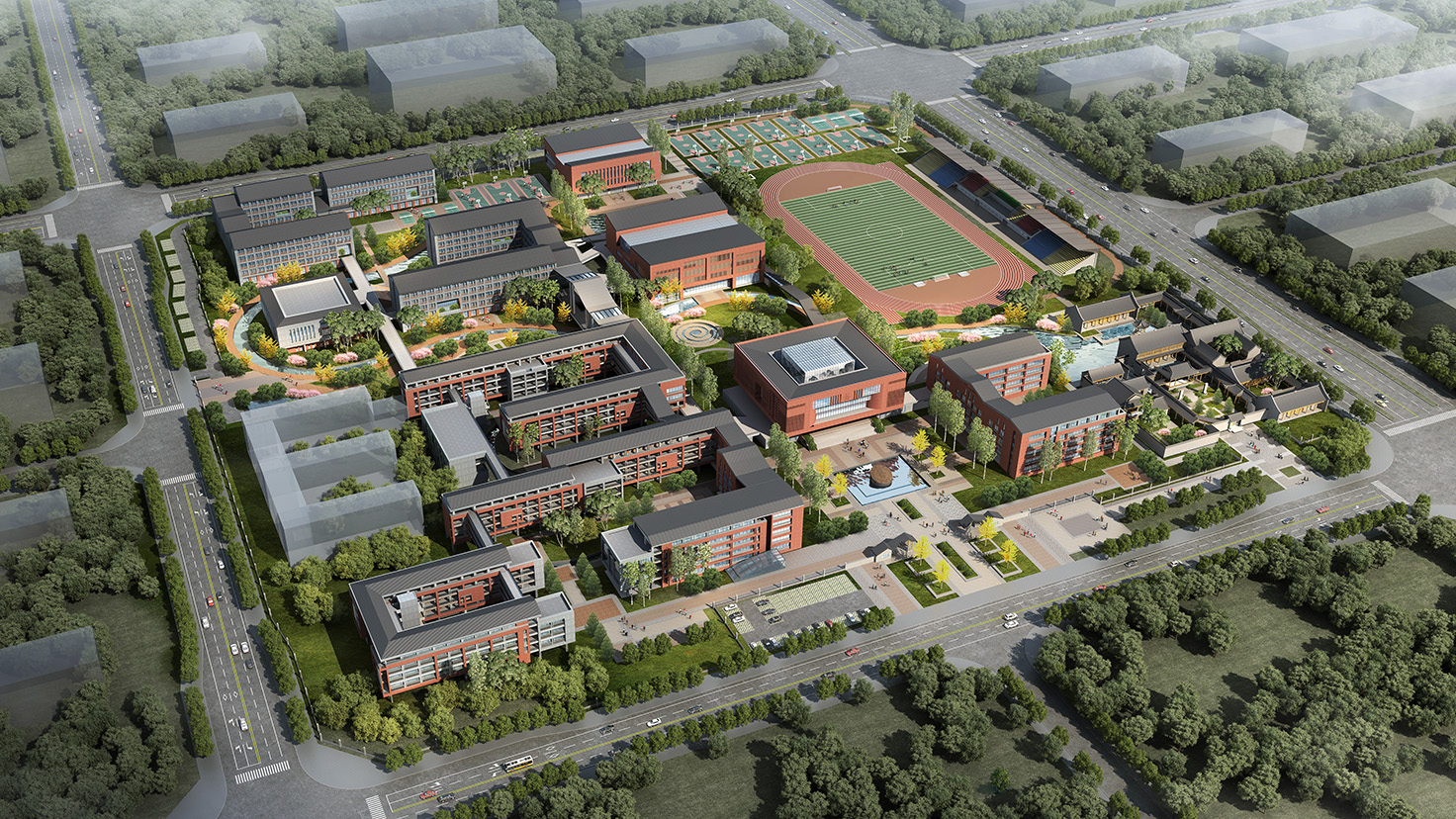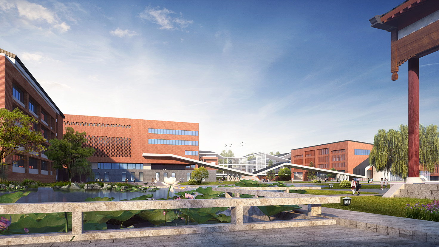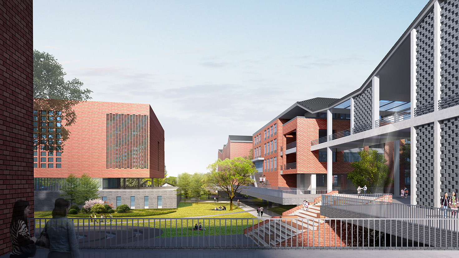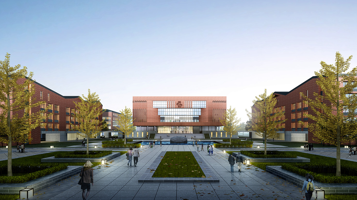 設(shè)計背景: 布局合理、緊湊高效、簡潔大方、氣質(zhì)高雅,靈動韻律”是本方案的設(shè)計特點。 1.理性的教學(xué)空間 學(xué)校既是學(xué)生接受教育并進行信息專遞的理性空間,也是學(xué)生相互之間進行情感交流的感性場所。因此,我們提出理性與感性相結(jié)合的設(shè)計理念,利用傳統(tǒng)的四方院落布局與入口的開闊廣場塑造一個理性、包容的教學(xué)空間。 2.多樣化的庭院空間 因為學(xué)校各建筑功能的豐富性以及獨特性,我們將建筑進行人為的動靜分區(qū)以保證其良好的教學(xué)秩序,但是各功能區(qū)通過連廊相連接,圍合成多變的組團空間,不同尺度的內(nèi)庭院相串聯(lián),營造出安靜、舒適的教學(xué)與活動環(huán)境。 3.包容的入口廣場區(qū) 學(xué)校的主入口為整個學(xué)校的形象展示區(qū),設(shè)置在基地南面,由教學(xué)科技樓、綜合樓和圖書館三面圍合而成,形成開放、包容、向上的文化形象。