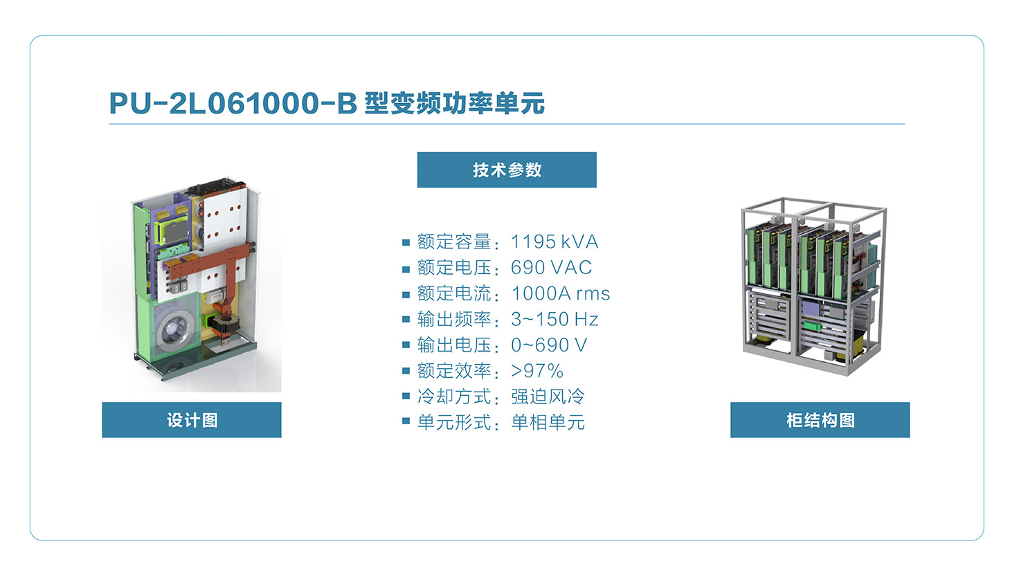 額定容量:1195 kVA 額定電壓:690 VAC 額定電流:1000A rms 輸出頻率:3~150 Hz 輸出電壓:0~690 V 額定效率:>97% 冷卻方式:強(qiáng)迫風(fēng)冷 單元形式:?jiǎn)蜗鄦卧?/span>