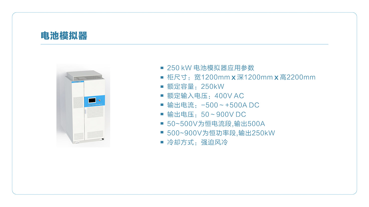模擬器采用四象限PWM整流技術、雙向DCDC技術和純數(shù)字控制技術,具備輸出穩(wěn)定精度高、瞬態(tài)響應迅速、能量雙向流動等特點,可模擬動力電池充放電等動態(tài)特性。同時具有RS485、以太網(wǎng)等遠程通訊接口,可以與上位機連接形成智能系統(tǒng),實現(xiàn)對電池模擬器運行狀態(tài)的實時。可編輯設定不同電池類型、串并聯(lián)數(shù),不同SOC等變量條件電池特性,可以自定義電池變化特性。