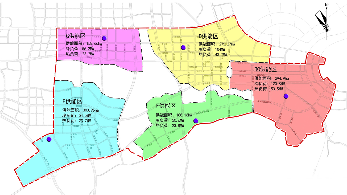 項目規(guī)模:重點規(guī)劃范圍約15.1平方公里,共規(guī)劃5座區(qū)域能源站