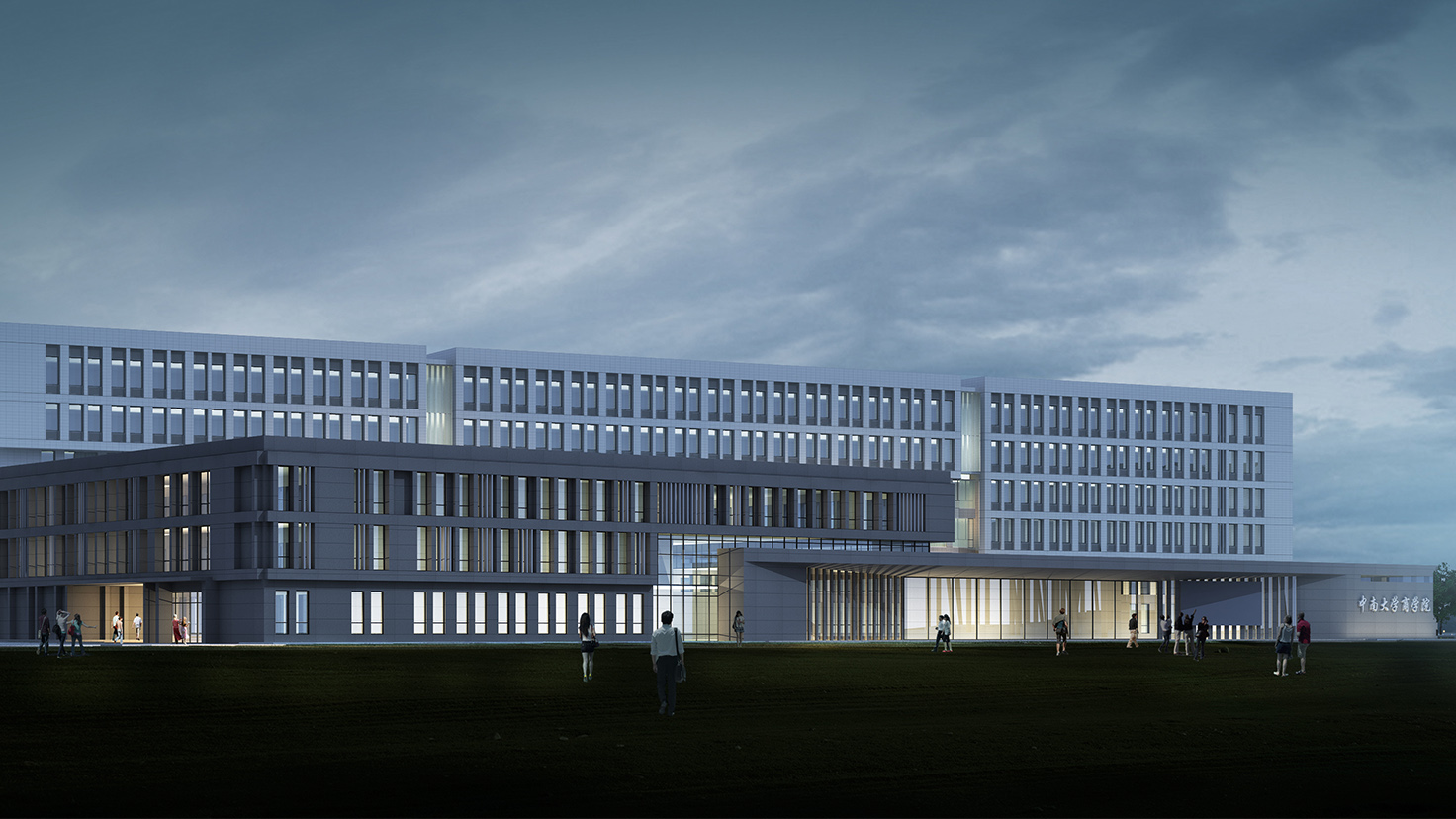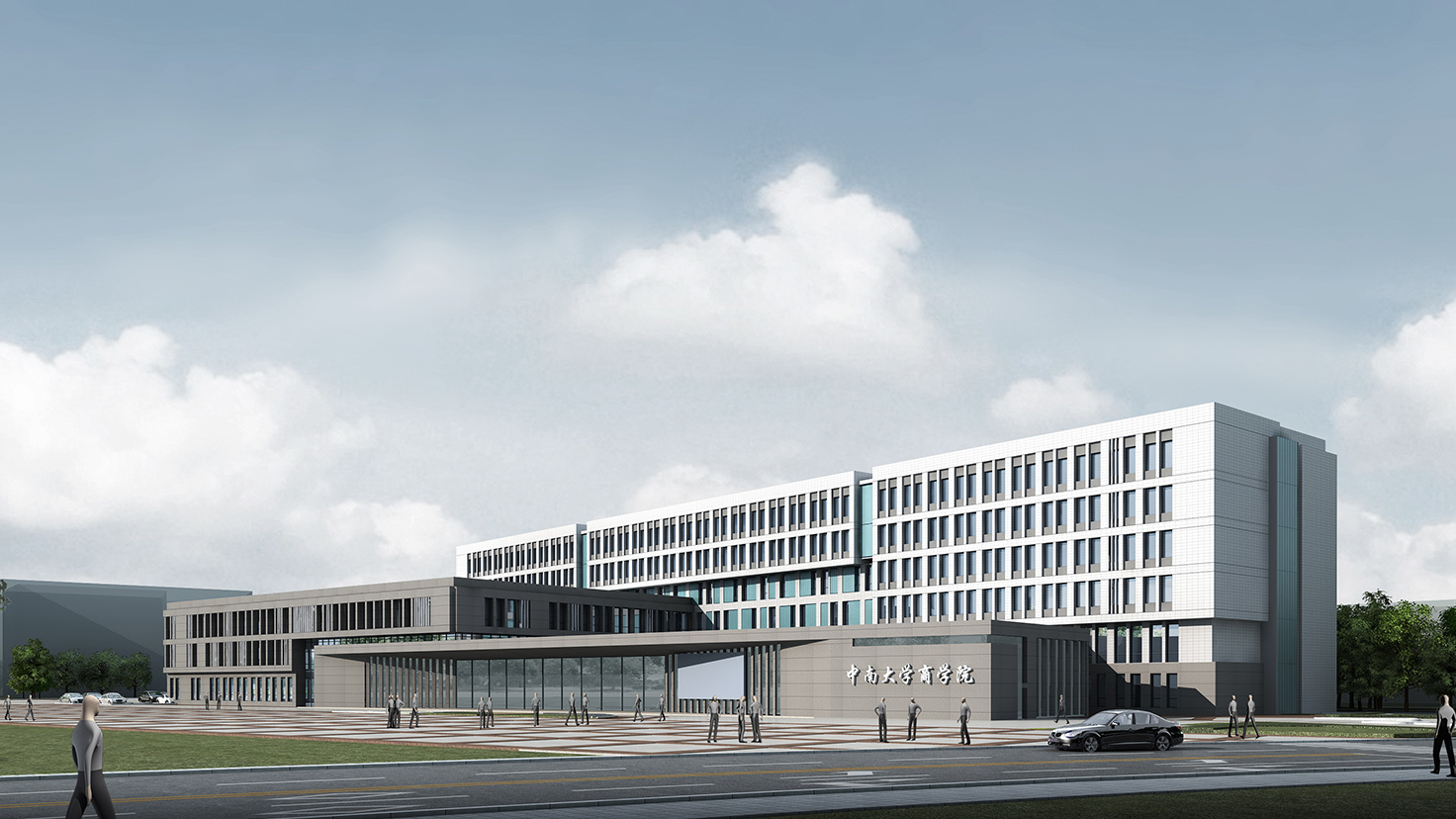 設(shè)計背景:中南大學(xué)作為以工科為主的院校,新校區(qū)的建筑大多側(cè)重于厚重,敦實,外觀簡潔實用;而商學(xué)是注重實戰(zhàn)的學(xué)科,注重交流,與人溝通,是站在時代前沿的行業(yè)。作為校區(qū)東大門的第一棟教學(xué)科研建筑,我們希望商學(xué)樓的外形是大氣的、凝重的、敦實的,能充分體現(xiàn)商學(xué)院沉穩(wěn)的、具有人文氣息的特質(zhì),成為新校區(qū)建筑形態(tài)的經(jīng)典之筆。